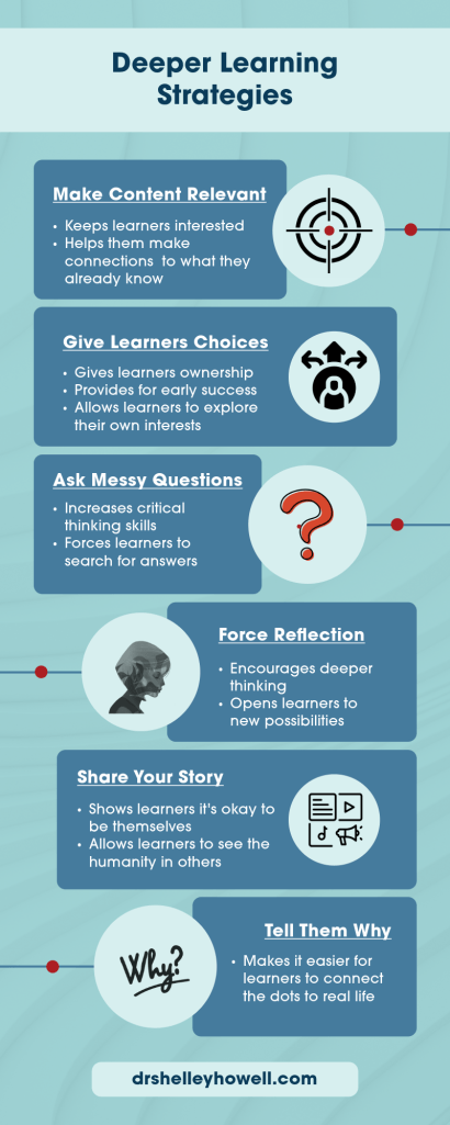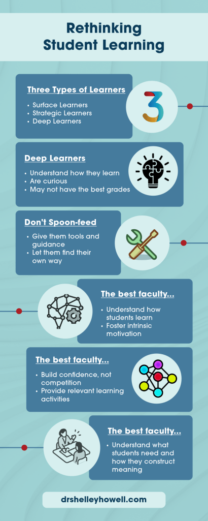 To get us started, here are two presentations and an infographic I created a few years ago on deeper learning strategies and what the best faculty do to enhance student learning. These are tips that anyone can use in a classroom, online, or in training. Enjoy!